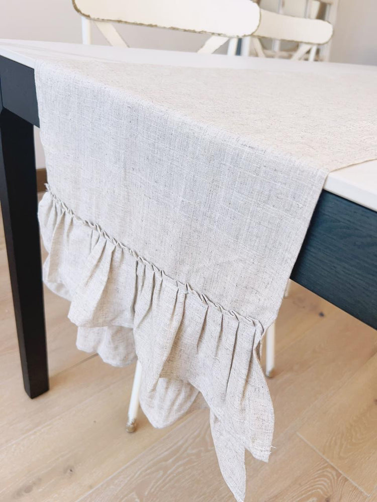 Este camino de mesa está hecho de lino y tiene un diseño elegante con vuelos, perfecto para añadir un toque decorativo a cualquier mesa. Con su estilo refinado, este producto es ideal para cualquier ocasión y le dará un toque de sofisticación a tu hogar.