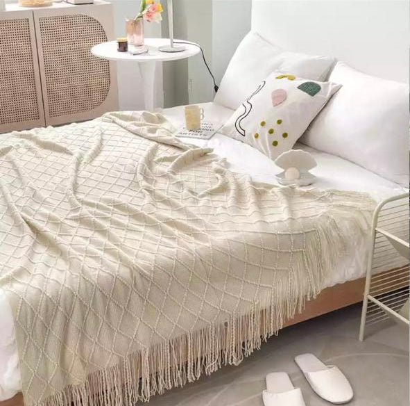 La Manta Rombos Crudo es el complemento perfecto para tus noches frías. Con su tamano XL y su suave tejido, te envolverá en una sensación acogedora y relajante. Además, gracias a su diseño de rombos, también funciona como una piecera decorativa para tu cama. Disfruta de su comodidad y estilo en una sola manta.