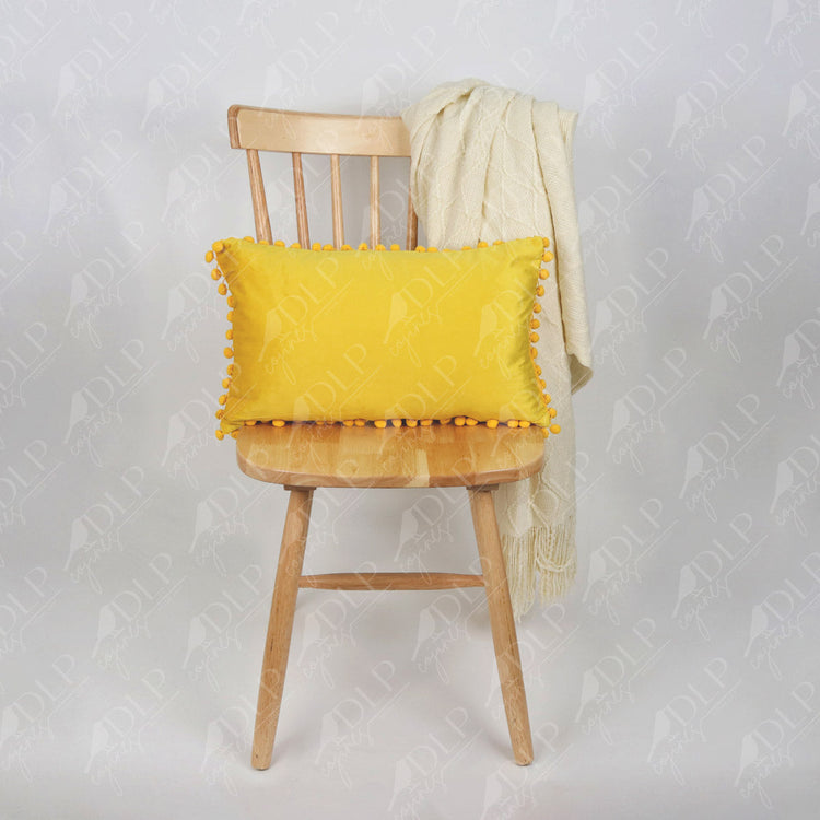 Funda terciopelo mostaza con pompones.