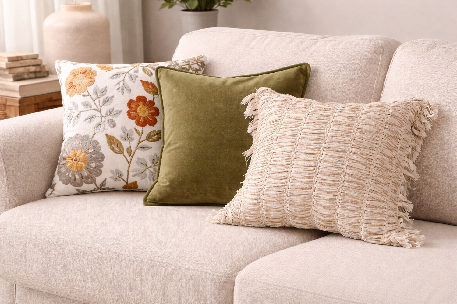 Su tono neutro permite integrarlo fácilmente con otros cojines lisos o estampados, creando composiciones equilibradas y llenas de personalidad.