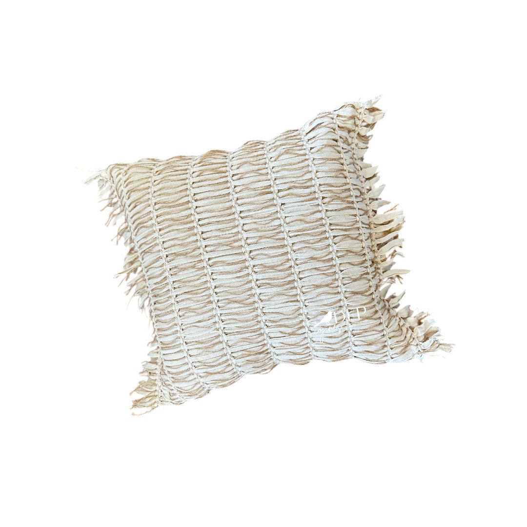Esta funda de cojín en algodón entrelazado con hilos de yute destaca por su diseño artesanal y su textura rica en detalles, ideal para crear ambientes acogedores y naturales. Su tejido decorativo con flecos aporta un toque boho y rústico que combina perfectamente con estilos modernos, escandinavos o naturales.
