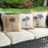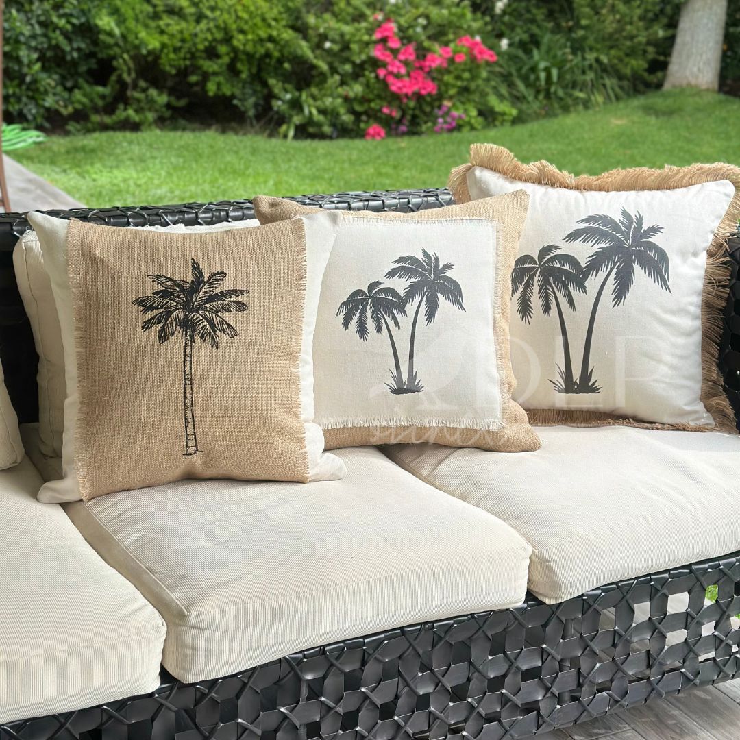 Este pack de cojines decorativos con diseño de palmeras combina texturas naturales y tonos neutros que evocan un estilo tropical elegante. Su mezcla de telas tipo lino y yute aporta calidez y carácter, ideal para crear ambientes relajados en terrazas, livings o espacios exteriores techados.