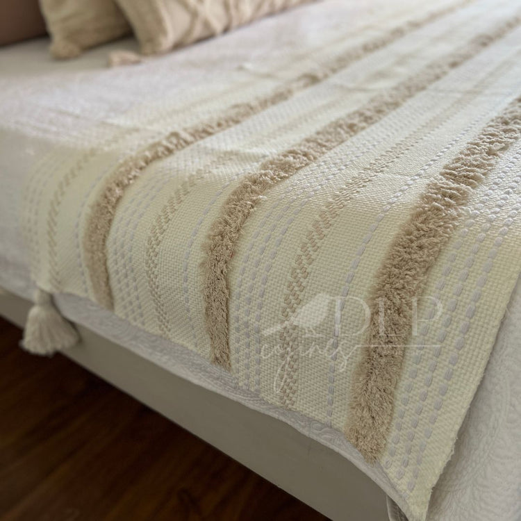La piecera Los Cabos es una piecera cruda con elegantes aplicaciones en beige, forrada para una mayor comodidad. Esta piecera es perfecta para combinar con cualquier estilo de decoración y cuenta con borlas que le añaden un toque adicional de sofisticación. ¡Mantén tu cama cómoda y elegante con la piecera Los Cabos!